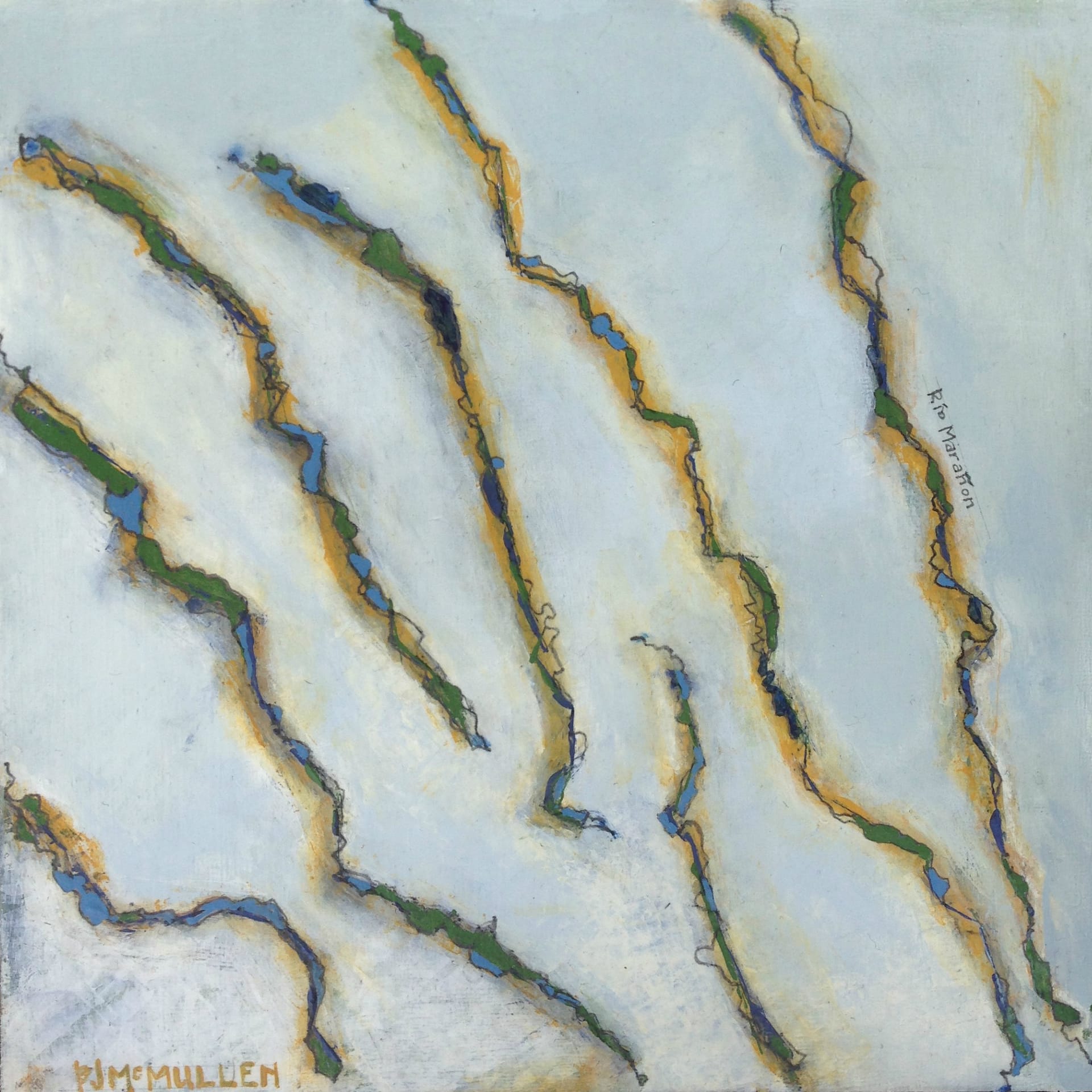 In honor of its northwest flow, this expression of the Río Marañon begins at the lower right of the painting and is celebrated in seven northwest-moving segments commemorating the January 2015 kayaking journey of Jodie Deignan.