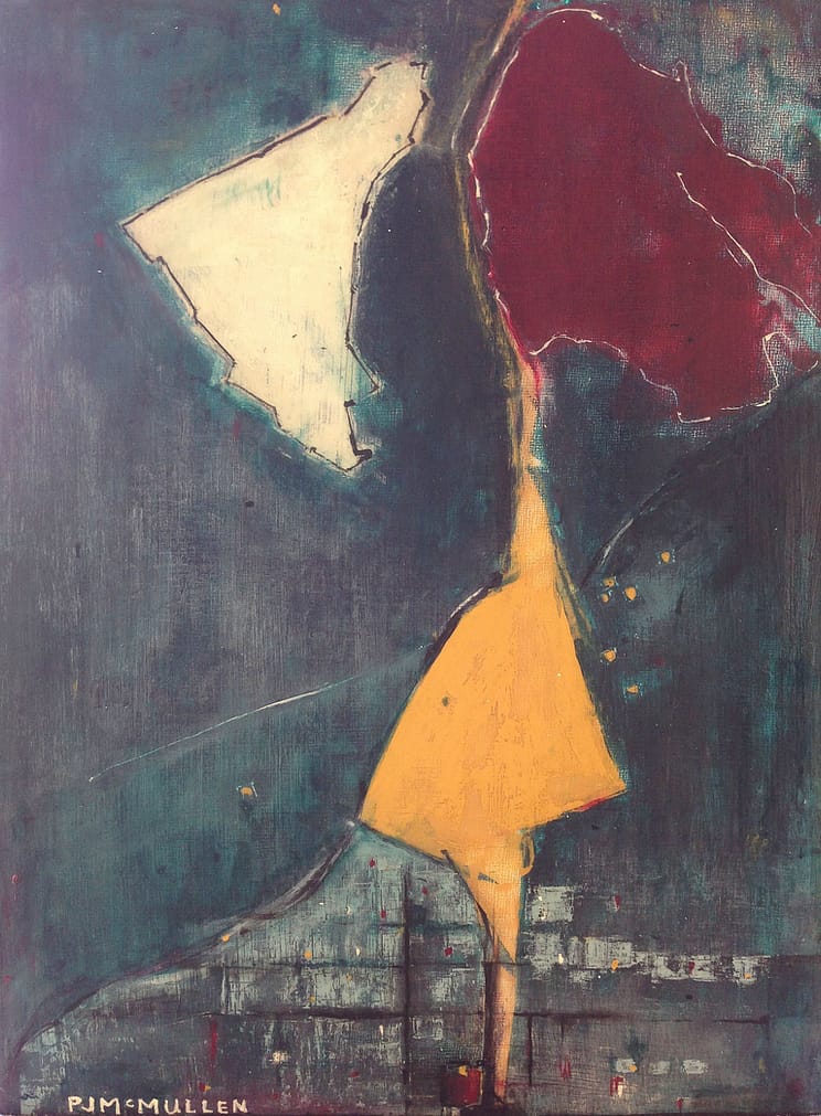 The parchment and crimson configurations at the top of the painting are abstractions of the northern regions of Ghana where Awenlue and Anthony Karbo have tribal ancestors. In yellow, and birthed from above, is an abstraction of Tema, Ghana, where they reside. Held and grounded below the yellow Tema is the geometry of a NE Portland, Oregon neighborhood where Awenlue grew up.